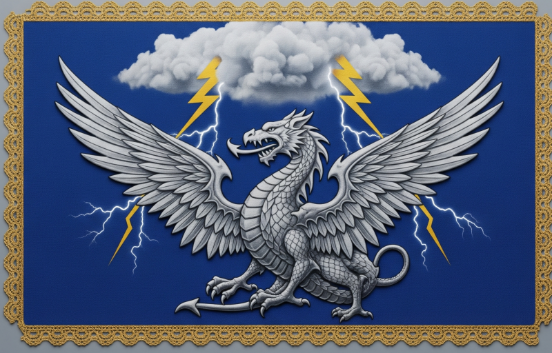 A winged silver dragon on blue with billowing clouds above, a gold lightning bolt striking out from the clouds on either side of the dragon. Silver gold and blue were Esscha Endor's colors.