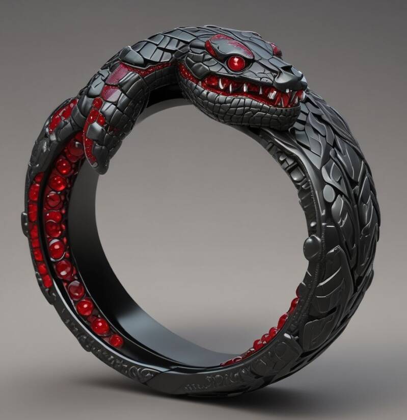 The Ring: snug fitting black diamthrill, twined snakes with ruby eyes. When twisted all the way around armour manifests. Divested when ring twisted around again. Ring does not come off once it's worn. Removal by maker Aramael Arilias required.