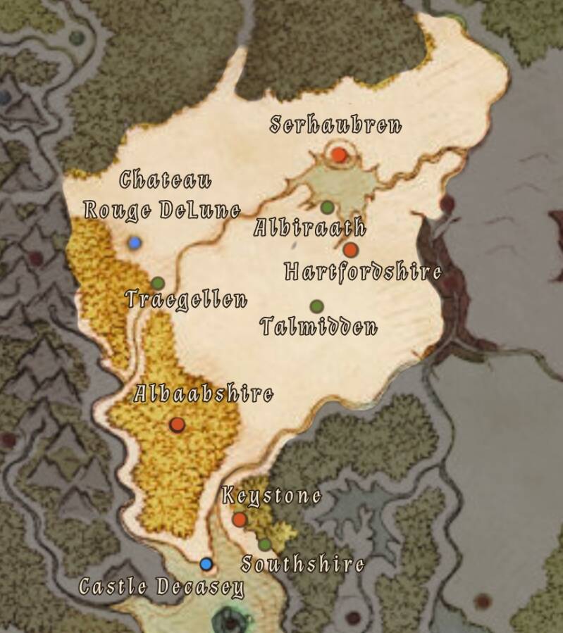 The Inn faces East. West beyond the grounds is a 1000 acre forest land known as Hunter's Forest. To the east and west are gently rolling meadows, and further west, well in sight of the Chateau, are the Lonely Cavern Mountains' High Peaks. To the North is an orchard, and to the south vinyards stretch for miles from Hunter's Forest to the Great Eastern River where it flows out of Demon Horn Lake. All as far as the eye can see is part of the Inn's property and the district of Traegellen which Byron owns and rules over as Count.